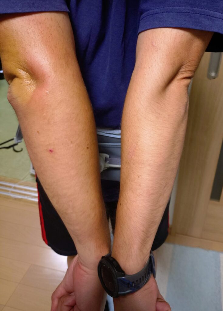 「痛ぇーー!」と一瞬右肘辺りに激痛が。