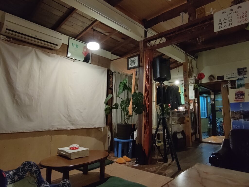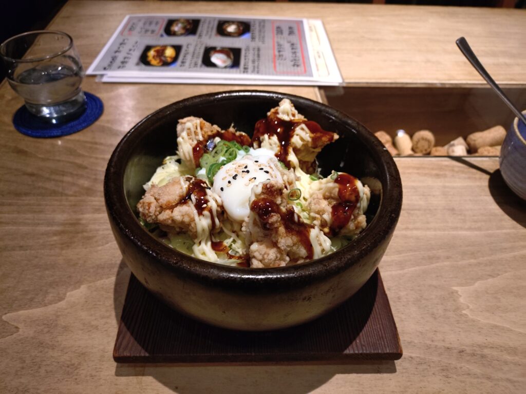 外で夕飯(石焼き唐揚げ丼)食べた後、宿のバーでノンアル飲んで